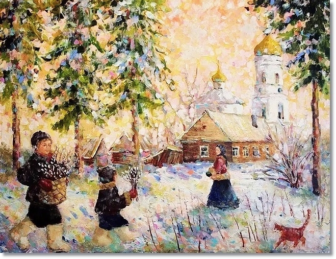 Ах, какой радостный горьковатый запах, чудесный, вербный! И в этом запахе что-то такое светлое, такое, такое. Смотрю на мохнатые вербешки. Таких уж никто не сделает, только Бог. Нигде сейчас не найтись цветочка, а верба разубралась. И завсегда так, на св. Лазаря, на Вход Господень. И дерева кланяются Ему, поют Осанну. Осанна-то? А такое слово, духовное. Сияние, значит, божественное, Осанна. Вот она с нами и воспоет завтра Осанну, святое деревцо. А потом, дома, за образа поставим, помнить год цельный будем.