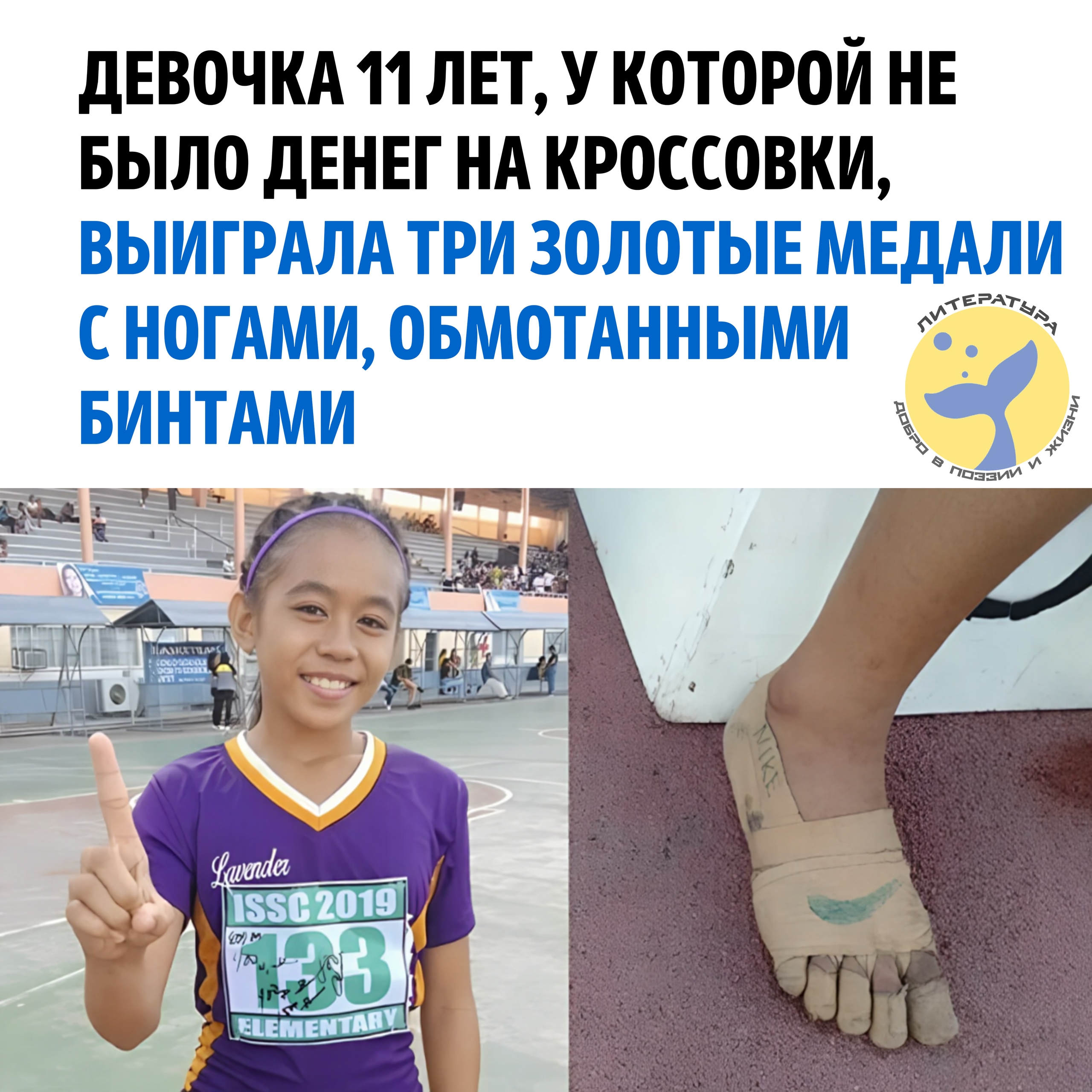Не имея денег на кроссовки, она нашла выход: обмотала ноги медицинскими бинтами и нарисовала ручкой логотип известного бренда.