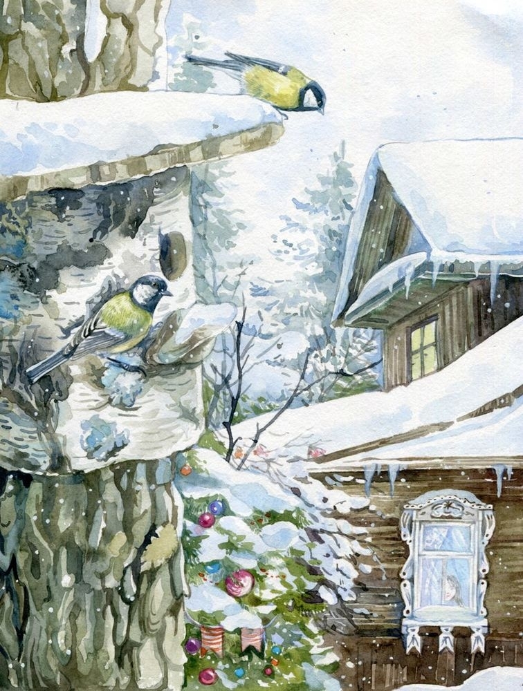 "А вечером у Манюни была елка, дети кричали и топали, но синички нисколько на них за это не сердились. Теперь они знали, что с елкой, украшенной огнями, снегом и игрушками, приходит Новый год, а с Новым годом возвращается к нам солнце и приносит много новых радостей."